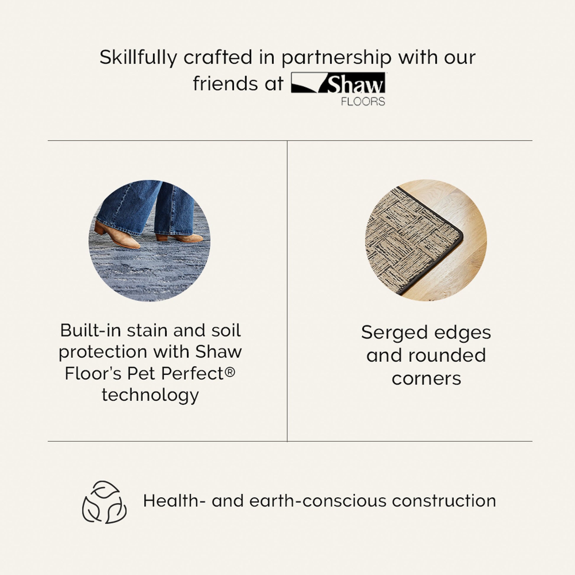 A textural style in an array of neutral hues, the Mockingbird Textured Custom Rug is designed to complement any space. Featuring Pet Perfect Technology from our partners at Shaw Floors, this piece is constructed of hard-wearing, high-performance fibers with built-in protection against stains. It’s super durable and easy to clean to ensure you’ll get to enjoy your made-to-measure rug for years to come. It's even Green Label Plus Certified, which means it promotes good indoor air quality for you and your family. Plus, it’s made with Cradle to Cradle Certified® materials that have been verified as safe for people and the planet alike.